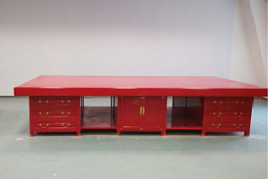 傳統(tǒng)字畫裝裱案1、臺(tái)面尺寸:2*4m;(可按要求定做)2、選材:選用質(zhì)地較硬、無(wú)疤、無(wú)蟲蛀、不變形陳舊杉木或松木制作;3、工藝:手工制造,榫卯結(jié)構(gòu)拼接而成,案面和支撐柜可分離;臺(tái)面油飾基層處理為傳統(tǒng)的“二麻六灰地仗”工藝,接縫嚴(yán)密,臺(tái)面平整,圓弧形棱角,四周加固邊框、臺(tái)背面有加撐措施;油飾骨料選用特級(jí)優(yōu)質(zhì)的天然大漆,多次上漆,臺(tái)面顏色為大紅色。4、地柜所使用主料同臺(tái)面相同為框架結(jié)構(gòu),實(shí)木板材。油飾