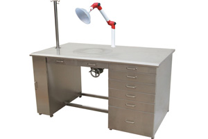 工作臺需設有上、下抽吸的功能,配備可旋轉(zhuǎn)可升降的圓形升降工作臺,承重量40KG,以及臺面可調(diào)高度掛物架,主材采用厚度為1.2mm不銹鋼鋼板,牌號為優(yōu)質(zhì)冷軋不銹鋼鋼板,吸塵孔通風面積不得小于7000.mm2,工作分貝40。功能:本工作臺用料夯實,外形美觀,可用于較重文物的修復。升降工作臺可360°旋轉(zhuǎn),使用方便。灰塵可通過升降小工作臺周圍的除塵孔φ5mm抽至外接的吸塵器,以保持臺面空氣的清潔。通過處理后的空氣可直接排回室內(nèi),達到國家標準無需再另接外排管道。