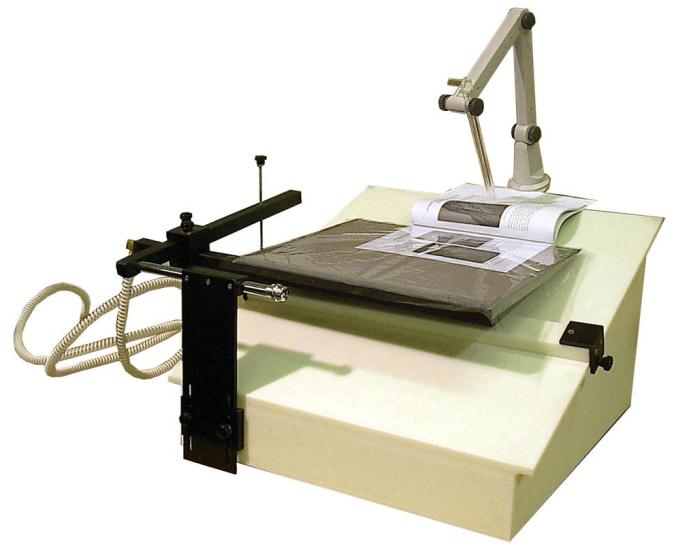 書籍抽氣設(shè)備由一個(gè)很薄的楔形抽氣平臺(tái)和一個(gè)安置書籍的高密度聚乙烯(HDPE)臺(tái)架所組成。楔形氣